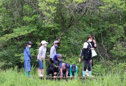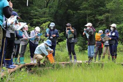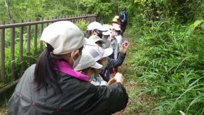 6月23日、全校で矢並湿地へ観察会に行きました。昨年度はコロナの関係で行けなかったため、久しぶりの湿地に子どもたちは大喜びでした。自然観察の森の方から湿地の植物や生き物についてお話を聞いたり、学年や班で観察をしたりしました。