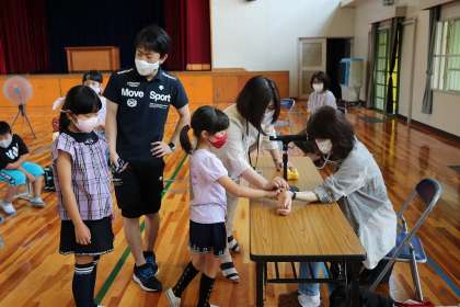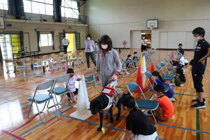 6月29日、3・4年生が障がいを理解するための実践教室を行いました。視覚障がい者の方にきていただき、普段の生活の様子からお話していただきました。腕時計ではどうやって時刻を知るのか、触らせていただき、音や触感で判断すること、郵便物や映画の見方等、自分たちが何気なく行っていることが難しいことに気づきました。また、声を出して信号を教えたり、手をさしだし案内するなど、自分たちができることを知りました。盲導犬が仕事をしているところも実際に見せていただきました。