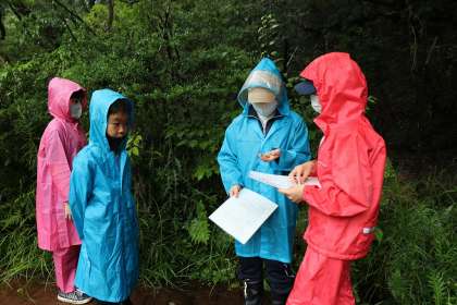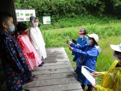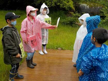 7月7日、あいにくの雨でしたが、矢並湿地へ行き、5・6年生が3・4年生を相手にガイドをしました。前回観察をして、自分たちが気に入ったものについて調べ、それをガイドしました。ヒメギスやモウセンゴケなど矢並湿地の生き物の実物を使い、様々な工夫をしながらガイドすることができました。