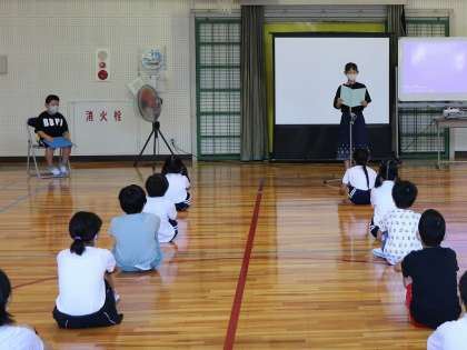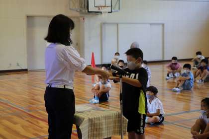 7月20日、休業前集会を行いました。久しぶりに全校児童が体育館に集まり、代表の子2名の発表を聞きました。2人とも、今まで頑張ってきたことと、今後の抱負をしっかりと発表しました。また、高橋コミュニティ会議主催のあいさつ運動標語コンクールで優秀賞をとった児童の表彰も行いました。