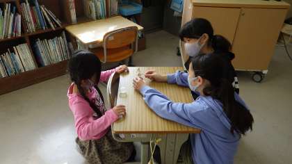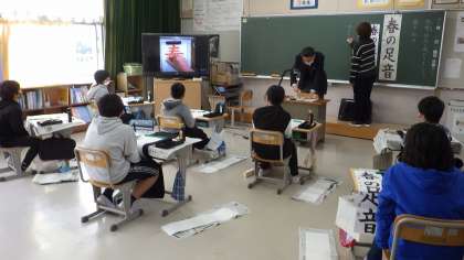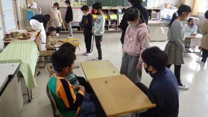 12月8日、1年生がどんぐりを使ったおもちゃを作り、他の学年を招いて遊びました。いろいろ工夫を凝らしたおもちゃが勢ぞろいし、上学年の子たちも楽しそうに遊んでいました。1年生がしっかり自分のおもちゃについて話したり、上学年の子たちが優しく聞いたり、ほめたりしていたのも印象的でした。3〜5年は、お手本を書かれた先生が来てくださり、書き初め練習をしました。みんな一生懸命練習していました。