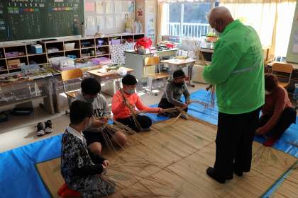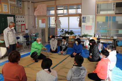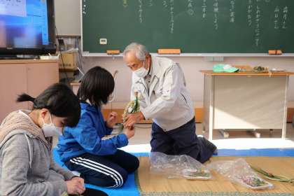 12月13日、5年生が地域の方に教えていただき、しめ縄作りをしました。これは自分たちが田植えをして育てた稲を、稲刈り・脱穀し、最後に残った稲わらを使って作りました。最後に素敵なしめ縄飾りができ、子供たちも大喜びでした。地域の方に感謝です。