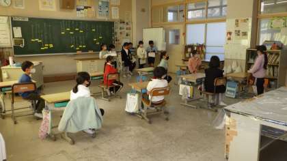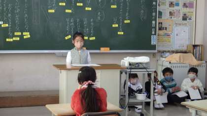 1年生が2年生へ、入学してから楽しかったことを発表しました。「春は、学校探検が楽しかったです」「秋は鞍ケ池へ遠足へ行ったのが楽しかったです」など、1年を振り返って楽しかったことを堂々と発表することができました。聞いている2年生も、良い姿勢でうなずきながら聞き、温かい感想を言うことができました。