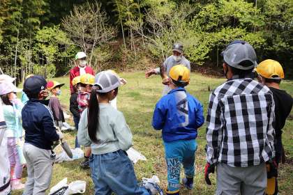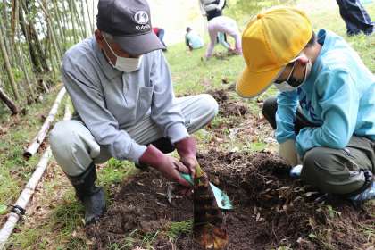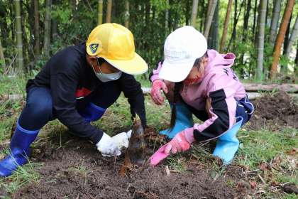 4月19日、地域の方のご厚意で、1・2年生がタケノコ掘りをさせていただきました。初めてという子も多く、一生懸命タケノコと格闘し、掘り出したタケノコに、「うわあ、大きい!」「見て見て!」と大喜びでした。準備もしていただき、お土産までいただきました。春のすてきな体験をありがとうございました。