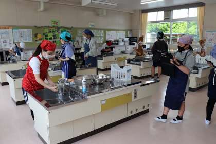 また、今日は5・6年生が調理実習で「ゆで野菜のサラダ」を作りました。密にならないように、一人一つの調理台で、自分の分を作ります。作っていない時は、タブレットを使って動画撮影。後で振り返ることができます。「おいしかった!」「ドレッシングがすっぱかった!」と楽しんで学習できました。