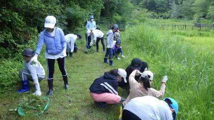 1・2年生は観察です。担任やレンジャーさんから湿地のいろいろな生き物を教えてもらい、「いたいた!」と喜んでいました。観察の後は、草取りをしました。外来種の草を取り、湿地に生息する植物などを守ります。暑かったですが、3〜6年が班に分かれ、一生懸命取っていました。矢並湿地を守らなきゃという意気込みが伝わってきました。