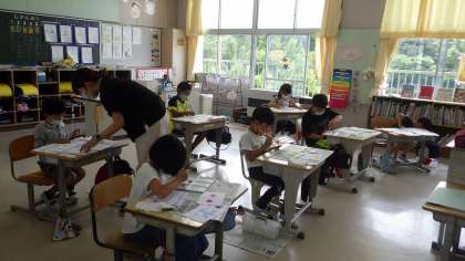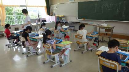 6月13日の授業の様子です。1年生は絵の具の使い方を学習しています。どこに絵の具を出すのか、水をどうやって使うのかなどを細かく学習しています。2年生はカッターを使っていました。カッターを立てて使うこと、反対の手の置き方など、1対1で担任が教えていました。3年生は国語で、タブレットを使って、自分の調べたことについてまとめていました。まとめ方を詳しく伝え、その後、自分たちで調べた昆虫について、担任が席を回りながら見て、まとめていました。みんな一生懸命に取り組んでいました。