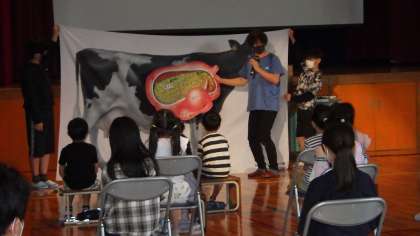 その後、元酪農家の講師の方から「いのちをいただく」というお話を聞きました。初め笑っていた子供たちもだんだんと真剣な顔つきになり、いのちをいただく意味を考えていたようです。振り返りには「これからは育てている人にも感謝をし、食べ物を作ってくれている人にも感謝をして食べなければいけないと思った。」などと書いていました。子供たちの食に対する意識付けになったのではないかと思います。