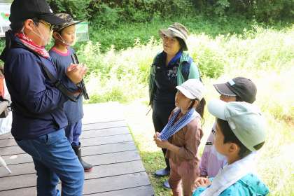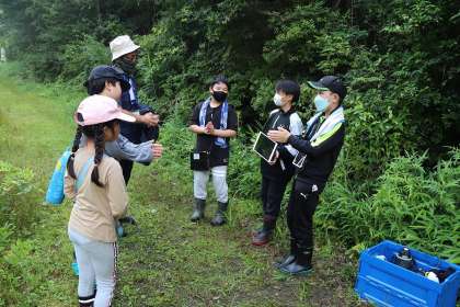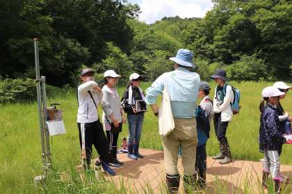 7月8日、6月から延期していた矢並湿地へ行くことができました。今日は、5・6年生が今まで調べていた夏の生物について、3・4年生に現地で実物を見せたり、タブレットで調べたことを見せたりしながら、発表しました。5・6年生が工夫をして分かりやすく説明した、モートンイトトンボや、キクラン、ゴウソなど矢並湿地の珍しい生物を3・4年生は見たり聞いたりし、「へえー、そうなんだ。」「すごい!」など、一生懸命に教わっていました。現地で実物を触り、実体験に基づいたすばらしい授業となりました。