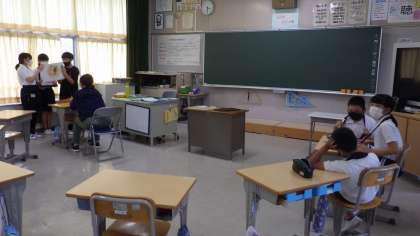 9月14日の5・6時間目、総合的な学習の時間に5・6年生が湿地ガイドに向けての練習をしていました。今まで調べた湿地の生き物について、子どもたちなりの視点から、ガイドをします。ペープサートあり、タブレットあり、劇あり、いろいろな工夫をしてのぞんでいます。今日も練習をしながら、もっとこうしたらよくなるかもとグループで話し合い、改良を重ねていました。9月27日のガイド学習日を楽しみにしていてください。