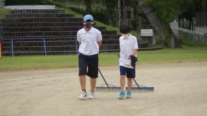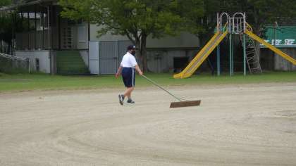 9月29日の掃除の時間、運動場を6年生が整備していました。今年度はものすごく草が生え、11月の運動会が心配でしたが、校内整備員さんがきれいにしてくださり、その後を6年生が引き継いで、進んでレーキで整備をしてくれています。おかげですっかり草も無くなり、みんなが安心して走れるような運動場になっています。6年生、ありがとう!
