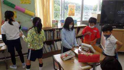 10月25日、今日は1年生が2年生を招待して、「どんぐりパーティー」をしました。1年生が集めたどんぐりを使って、いろいろなおもちゃを作り、2年生に遊んでもらいます。いつもはやってもらっている1年生が、今日は遊び方を2年生に教え、楽しそうに一緒に遊んでいました。どんぐりの迷路や、走る車、どんぐりとばしなど、楽しいおもちゃがいっぱいで、すてきな時間となりました。