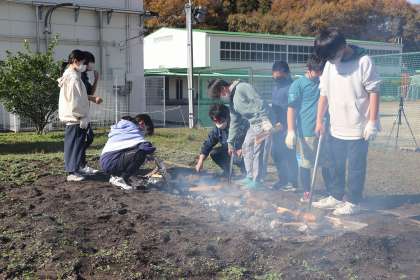 11月24日、焼き芋会がありました。なかよし班で育ててきて、先月収穫したさつまいもを、地域の方のご協力で焼き芋にしました。今年度は6年生が焼く手伝いをしました。できた焼き芋を、なかよし班で食べました。感染症対策のため、黙食でしたが、みんな嬉しそうに食べていました。