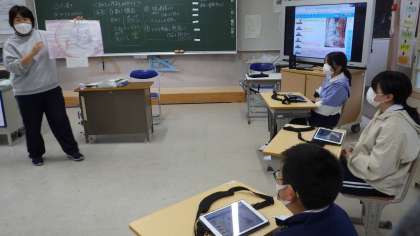 6年生は学習用タブレットを使って、読書感想画の鑑賞を行っていました。本物も見ながら、タブレットに写真を共有し、細かいところは、タブレットの画面を見ながら話し合いをしていました。
