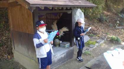 12月2日、2年生が地域のわくわく探検に出かけました。矢並・法沢・山中地区合わせ、これで4回目の探検です。今回は、山中地区に新しくできた「ドッグカフェ」や、お祭りなどで使う地域の「津島神社」、とよたの昔話にも載っている「あごなし地蔵」を見に行きました。お店の中を見学させていただいたり、地域の方が来てくださって説明してくださったり、今日もたくさん楽しく学んで帰ってきました。ありがとうございました。