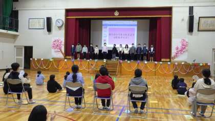 3月2日、今日は「6年生ありがとう会」を行いました。昨年度はコロナのためにオンラインで行いましたが、今年度は全校児童が体育館に入り、お祝いをすることができました。