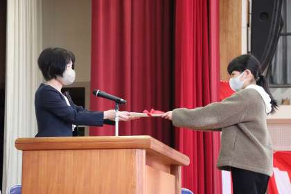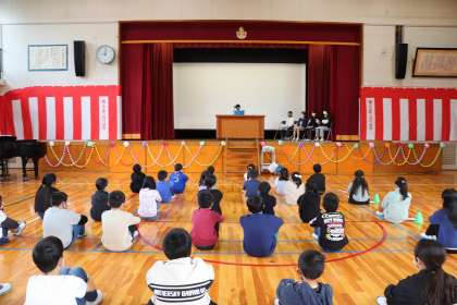 3月24日、修了式を行いました。全員名前を呼ばれて立ち、代表の子が校長先生から修了証をいただきました。みんな立派に受けることができました。その後、学年の代表の子がそれぞれ今年度がんばったことと来年度がんばりたいことを話しました。子どもたちの話の中には、「みんなのためにがんばりたい」「みんなに頼られる上級生になりたい」などと、他の子の役に立ちたいというすてきな言葉が聞かれました。校長先生からは、学習は1〜6年生までつながっているということ、4月元気に会えるようにというお話がありました。