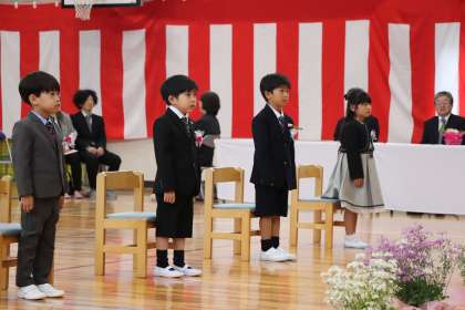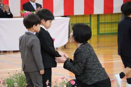 入学式・始業式では、新1年生が校長先生と握手をし、それぞれの椅子に座りました。校長先生から、本校の合言葉「つなぎ 新たな一歩を踏み出そう」から「あいさつ」「授業」「こころ」「いのち」をつなぐというお話がありました。