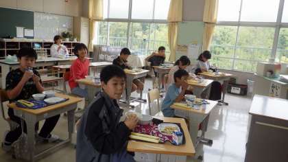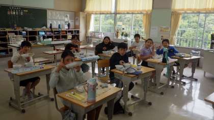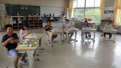 4月12日の給食の様子です。みんないい顔をして給食を食べています。コロナ対策が緩和されたといっても、なかなか3年前のようには戻れませんが、少しずつ学校生活が戻っていっています。