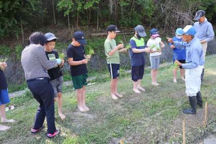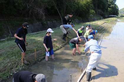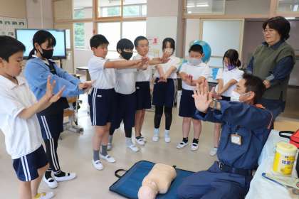 5月12日、今日は5年生が田植えと応急手当講習を行いました。田植えは地域の方のご厚意で、田の一部をお借りし、毎年行わさせていただいています。植え方を教えていただきながら、自分の場所にまっすぐになるようにおそるおそる植えていました。最後に自分の名札を立てました。これから成長を観察していきます。