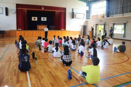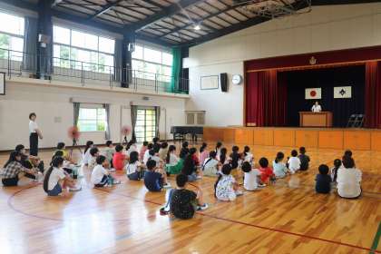 7月20日、明日から夏休みです。今日は夏休み前集会を全校で行いました。代表の子からは、「野球をがんばります!」「ガイドをがんばります!」という頼もしい話がありました。また、校長先生からは、42日の夏休みに、これをやったということができるように、何かやることを考えてほしいという話がありました。生徒指導の先生からは、「火」「水」「人」「車」に気を付けて夏休みを過ごしてほしいという話がありました。