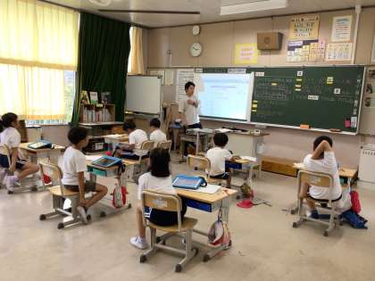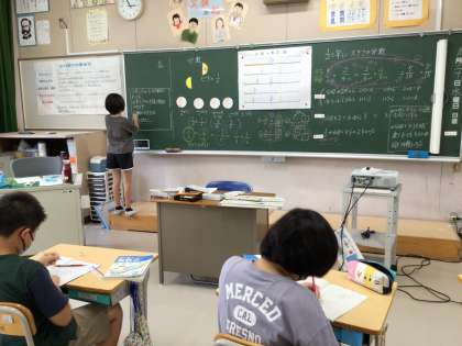 5年生は、「分数」の学習でした。等しい分数になるにはどうしたらなるのか、自分たちで考え、導き出した法則が教科書に載っていることと同じで、先生から、「みんなはすごい!」とほめられ、大喜びの子どもたちでした。