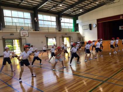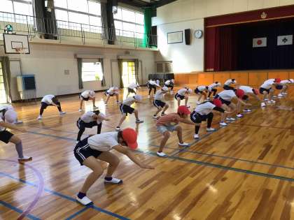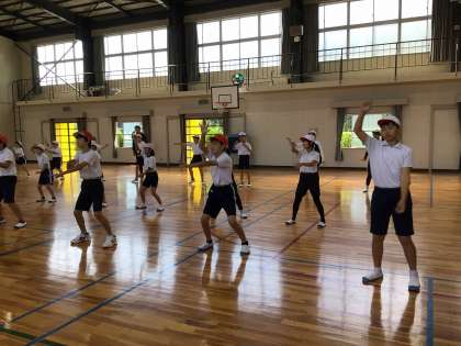 10月23日、4〜6年生の合同体育の授業の様子です。運動会で踊るソーラン節の練習を3学年で行っていました。一番前に6年生が並び、その後ろに4年生、一番後ろは5年生です。今年度新しくソーラン節を踊る4年生をはさんで練習です。