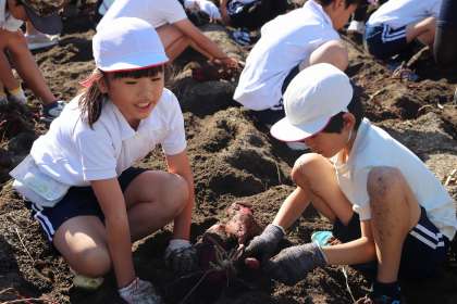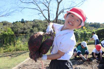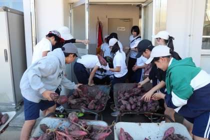 10月26日、なかよし班で育ててきたサツマイモの芋ほりをしました。ずっと一緒に育ててきてくださった地域の方から掘り方を教えていただき、いよいよ芋ほりスタート!ゴロゴロ出てくるサツマイモに「おっきい!」「いっぱいある!」とみんな大喜びでした。終わった後は、高学年が力を合わせて芋を運んだり、選別したりしてくれました。来月の焼き芋会が楽しみです。