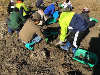 11月16日、近所の方のご厚意で、5・6年生が里芋掘りをさせていただきました。さつまいも掘りはしたことがあっても、里芋掘りは初めてという子も多く、親芋と子芋、孫芋の違いに驚きつつ、一生懸命に掘っていました。「親芋は食べないんだ!」「すごい!ゴロゴロ出てくる!」と新しい発見に驚いていました。貴重な体験をさせていただき、ありがとうございました。