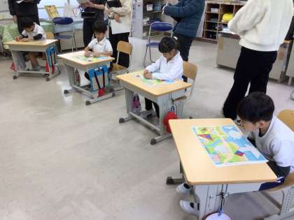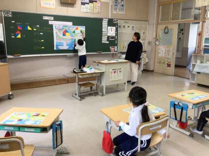 11月17日、1年生が算数の授業で、形づくりをしていました。三角形の色板を使い、家、ヨット、山、魚などを作りました。初め、「難しい!」と言っていた子たちも、形が作れると、「できたー!」と大喜び。作っていくうちに、「線をひくとやりやすい」「四角形を三角2つで作るとわかりやすい。」など、いろいろなことに気がつくことができました。