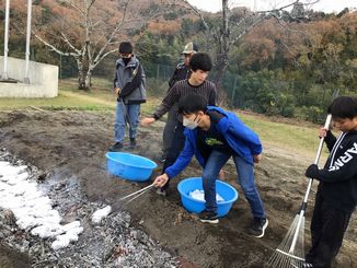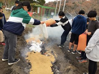その後、地域の方のご指導の下、火をつけたところに、芋を入れたり、もみがらをかぶせやりして、焼き芋ができるのを授業をしながら待ちました。