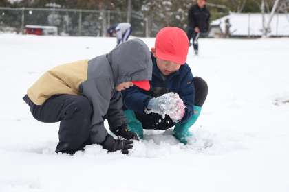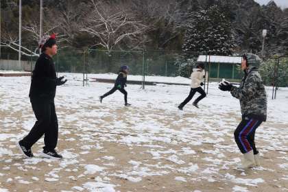 1月24日、今日は雪でした。登校時にしたから吹き上げるような雪に「寒い、寒い」を連発しながらも、休み時間には、みんな雪遊びで大喜び。雪合戦をする子たち、雪だるまを作る子たち、それぞれ自分たちの好きなことをしながら、空からの贈り物で遊びました。