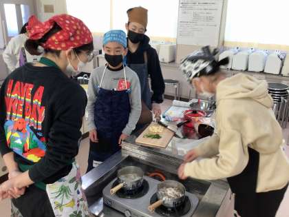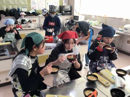 2月7日、5・6年生が家庭科「食べて元気!ご飯とみそ汁」で、みそ汁作りをしました。一人一人決めた材料を使って、自分のみそ汁を作りました。大根あり、ジャガイモあり、もやしあり、かまぼこあり・・・。みんなで飲み比べ、「これ、おいしい!」「初めてこれ食べた!」など、新しい発見もあったようです。またお家でもぜひ作ってほしいと思います。
