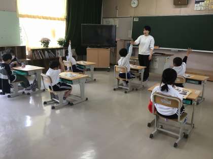 4月8日の授業の様子です。入学してまだ3日目ですが、1年生が生活科の授業を行っていました。みんな教科書の絵を見ながら、「はい!」と手を挙げ、見つけたことを話していました。早く学校に慣れていってほしいと思います。