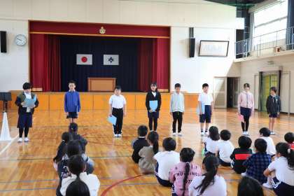 4月19日、6年生が中心となって「なかよし班はじまりの会」を行いました。初めに班を発表しました。6年生が前に並び、班の子の名前を一緒に叫びます。「ええー、わかんない!」「わかった!ここだ!」とみんなで楽しんで班を作りました。