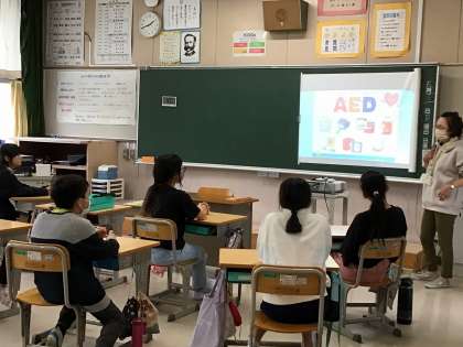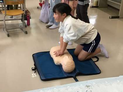 5年生が、心肺蘇生法(心臓マッサージ)とAEDの使い方を学び、人形を使って実際にやってみました。教えていただいた通りに、一人一人やることができました。