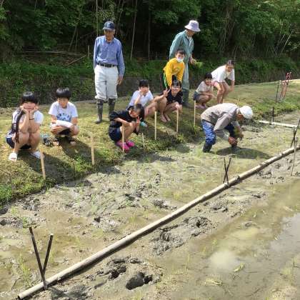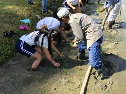 5年生の児童が、農家の方の米作りに対する思いを知るために、田んぼの一部を借りて稲の苗を植える体験をしました。地域の方に苗の植え方を教えてもらいながら、田んぼのどろに足をとられながらも最後まで植えることができました。