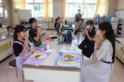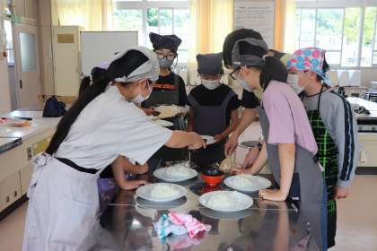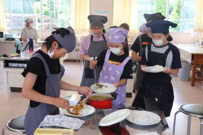 6月6日、5年生のキャンプまであと6日です。今日は5年生が野外炊事の練習を行いました。家庭科室で、ご飯とカレーを作りました。とても手際よく、みんなで協力して作り、予定時間を大幅に短縮して作ることができました。自分たちで作ったカレーに「おいしい!」と舌鼓をうち、パクパク食べていました。本番でも上手に作れるといいですね。