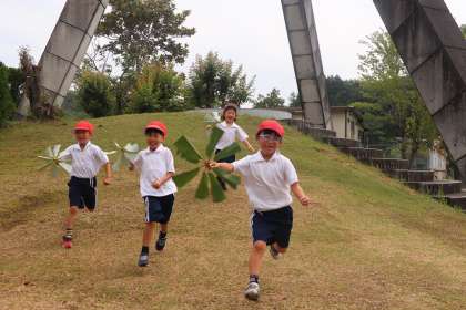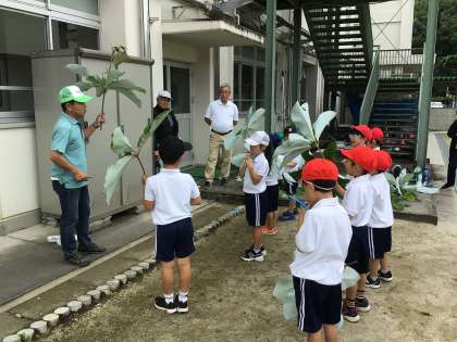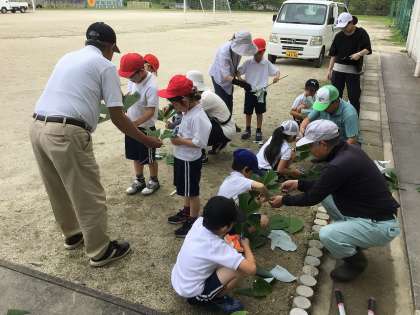 6月17日、1・2年生が地域の方に教えていただきながら、朴葉で風車を作りました。大きな葉っぱと戦いながら、一人一人自分の風車を作りました。できたらみんなで運動場を走り回りました。「見て見て!」「すごい回るよ!」と嬉しそうに風車を回していました。矢並小しかできない貴重な体験をさせていただき、ありがとうございました。