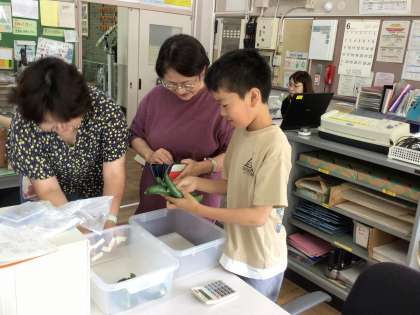 6月27日、やまゆりさんがやまゆり畑の野菜を収穫できたので、職員室の先生たちに売りにきました。「きゅうりは○○円です。ピーマンは○○円です。いかがですか。」「今日のおすすめはどれですか。」「ぼくのおすすめは、きゅうりです。お漬物にするとおいしいです。」など、先生たちとやりとりをしながら、お金の計算などし、売っていました。人とのやりとり、お金の計算、おつりの計算、言葉使い、礼儀などいろいろな学習が詰まっています。自分たちが育てた野菜を売り、その売り上げで校外学習に出かける計画を立てています。今年は豊作なので、たくさん売れるといいですね。