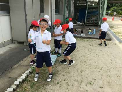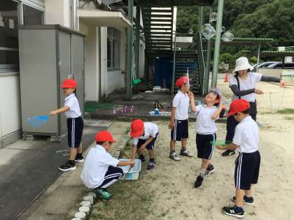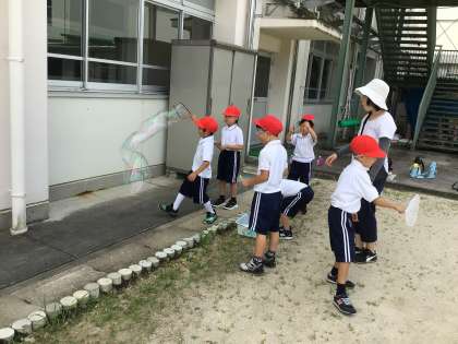 7月8日、1年生が運動場でシャボン玉遊びをしました。先週自分たちが作ったシャボン玉の物を持って飛ばします。大きいシャボン玉やかわいい小さいシャボン玉などたくさんのシャボン玉ができました。「見て見て!」「すごいすごい!」と歓声が上がりました。暑くなる予報が出ていましたが、朝の涼しい時間にたくさん遊ぶことができました。