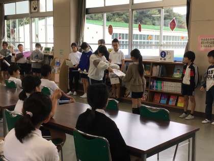 10月28日、緑の会で、お誕生日の子のお祝いをしました。一人一人になかよし班代表の子から「いつも楽しく遊んでいていいね。」とか「掃除をしっかりやっていていいね。」など、その子が頑張ったことを伝え、みんなからのお祝いメッセージとともに贈りました。その後、誕生日の子たちは、これからの目標を「掃除をしっかりやりたい」「算数が苦手だから、頑張りたい」などと、しっかり発表しました。