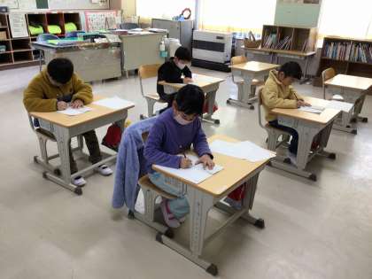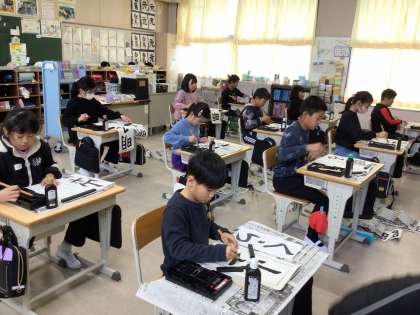 1月7日、いよいよ新しい年のスタートです。今日は全校一斉で書き初め大会を行いました。1・2年は硬筆、3〜6年は毛筆です。「冬休みに家でたくさん練習したよ」という子もたくさんおり、みんな一生懸命に集中して書いていました。この作品は、17日の授業参観時に廊下に掲示してありますので、ぜひ子どもたちの力作をご覧ください。