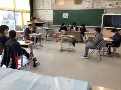 1月29日の高学年の授業の様子です。6年生は、模擬裁判を行っていました。裁判官や裁判員、弁護人、検察官などにそれぞれ扮し、裁判を行っていました。言い分を聞き合い、判決をくだしていました。6年生なりによく考え、理由なども話しながら行っていました。5年生は、外国語の授業で、ALTを相手に、お店の店員さんになり、注文を聞いていました。戸惑いながらも、上手に英語で会話をし、注文をとっていました。