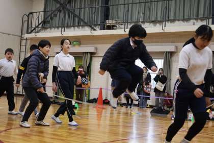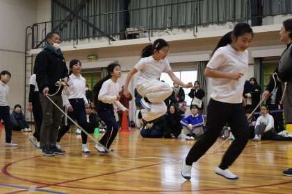 2月4日、なわとび納め会を行いました。初めに短縄で一人ずつそれぞれ自分の跳びたい技に一分間挑戦し、その後、低・中・高学年に分かれて、長繩で8の字跳びをしました。短縄では、すごい速さで跳ぶ子、自分のできる技を長く跳び続ける子など様々でしたが、保護者の方々の温かい声援と拍手につつまれて、みんな一生懸命に跳んでいました。長縄では、得意な子も苦手な子もいる中で、みんなで協力して練習してきた成果を出し切りました。5・6年生は、最高回数を出し、大喜びでした。