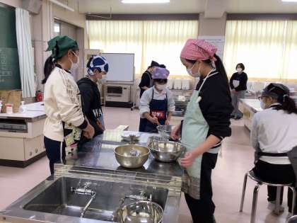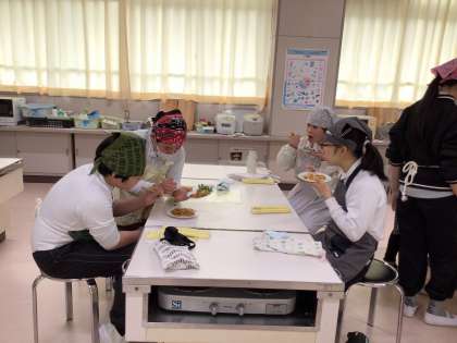 その後、炒めた野菜を食べました。少し人参がかたい班もありましたが、味付けはよく、みんなおいしそうに食べていました。食べ終わった後は、すぐに片付けを始めるなど、手際よく進めていました。