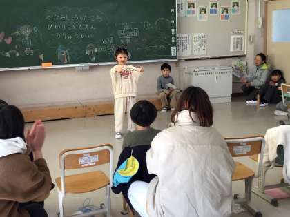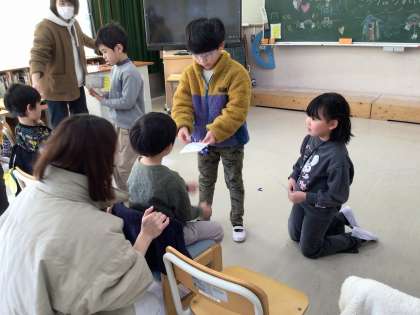 2月18日、こども園の子が学校に来て、1年生と遊びました。初めに1年生が「できるようになったこと」の発表をしました。「たし算ができるようになりました。」「あやとびがとべるようになりました。」と言いながら、こども園の子たちに発表しました。こども園の子たちも、園で作ってきたブロックを見せてくれました。1年生からは「すごい!」「上手だね。」と優しい言葉が聞かれました。あやとりや、けん玉、お手玉などの昔遊びを一緒に行い、楽しい1時間となりました。