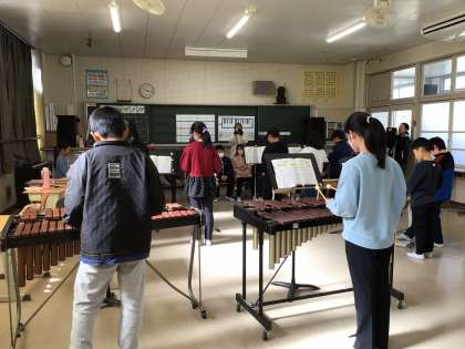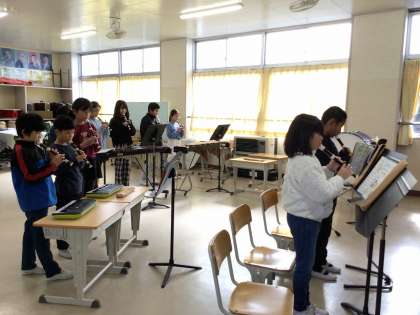 「オーラリー」という曲は、リコーダーのみで演奏し、リコーダーのきれいな音色が響きました。「茶色のこびん」という曲では、大太鼓や小太鼓、木琴、リコーダー、キーボード、ピアノで演奏しました。いろいろな楽器の音がきれいにまじりあいながら楽しい演奏でした。6年生からは、「音が合っててよかった。聞いてて楽しかった。」という感想をもらい、演奏した34年生は、うれしそうでした。