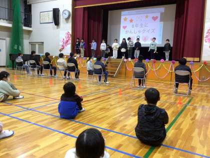 3月4日、全校で6年生ありがとう会を行いました。今までいろいろやってもらった6年生に対して、感謝の気持ちを込めて、1〜5年生が開きました。1・2年生は、「6年生クイズ」で、心に残ったことは?など6年生に関するクイズを発表しました。3・4年生は、「すごいね、6年生!」という6年生の一人一人の将来の劇を行いました。みんなでありがとうの花を6年生を囲んで歌ったときには、6年生も涙ぐんでいる子もいました。