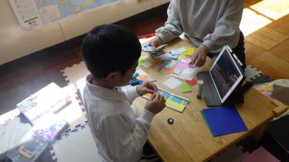 学習用タブレットを活用して、工作をしていました。写真は車輪を上手に作っているところです。完成するのが楽しみですね。